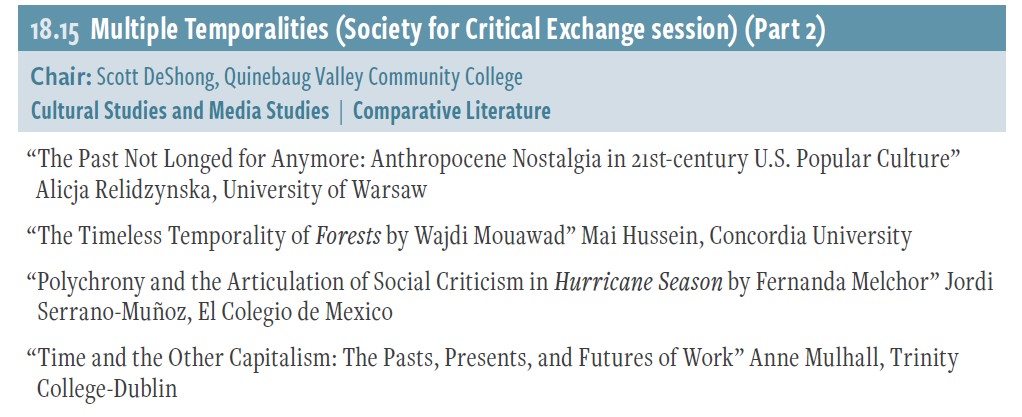 I participated last Friday 12th of March, 2021, at the 52nd Annual Convention of the Northeast Modern Language Association, this time held online, with a presentation on how Fernanda Melchor’s use of multiple voices, times, and spaces in her novel Hurricane Season helps promote an understanding of crimes as systemic instead of as isolated events. It was a great chance to discuss the way we articulate diegetic time affects the political connotations of a literary work.