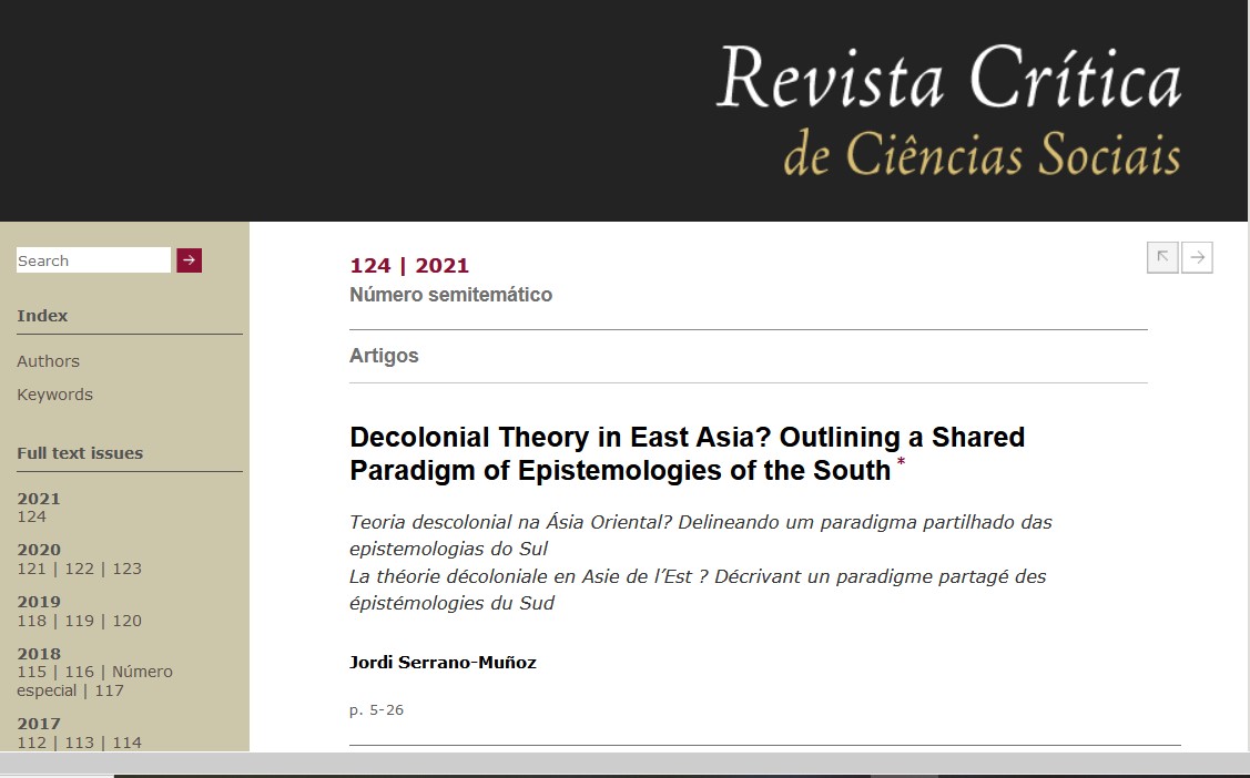 I am honored and thrilled to announce that my article “Decolonial Theory in East Asia? Outlining a Shared Paradigm of Epistemologies of the South” has been published in the issue 124 of Revista Crítica de Ciências Sociais. The abstract is as follows: