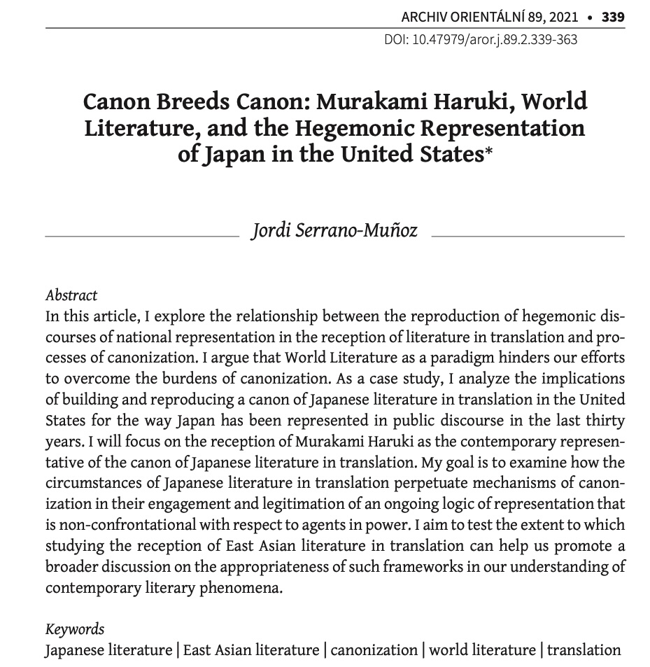 (2021) “Canon Breeds Canon: Murakami Haruki, World Literature, and the Hegemonic Representation of Japan in the United States“, Archiv orientální, 89 (2), 339-363. DOI: 10.47979/aror.j.89.2.339-363