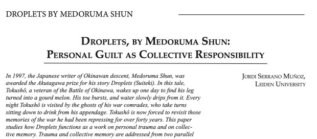 (2015) “‘Droplets,’ by Medoruma Shun: Personal Guilt as Collective Responsibility,” Stanford Journal of East Asian Affairs, 15:1, 112-122.