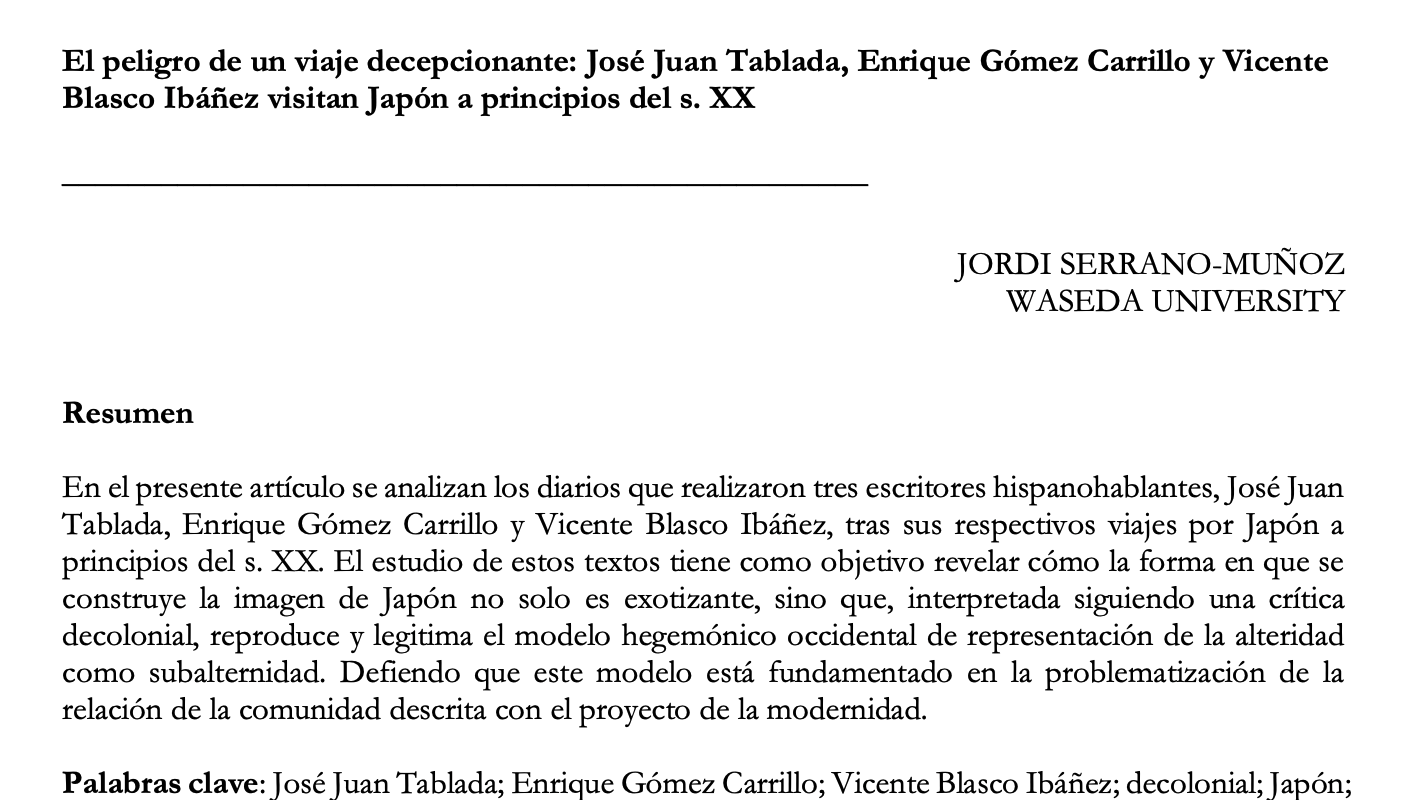 (2021) “El peligro de un viaje decepcionante: José Juan Tablada, Enrique Gómez Carrillo y Vicente Blasco Ibáñez visitan Japón a principios del s. XX“, TRANSMODERNITY: Journal of Peripheral Cultural Production of the Luso-Hispanic World, 9(7).
